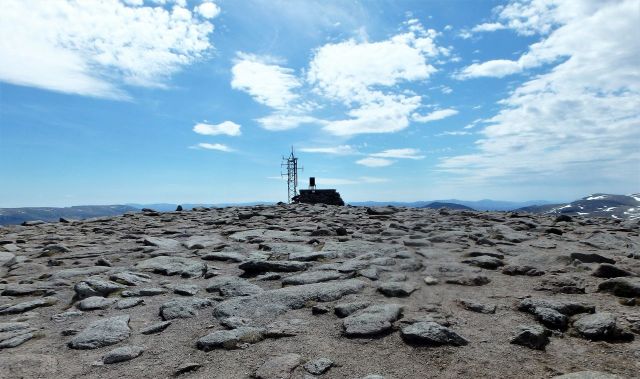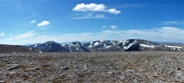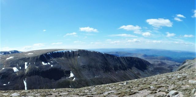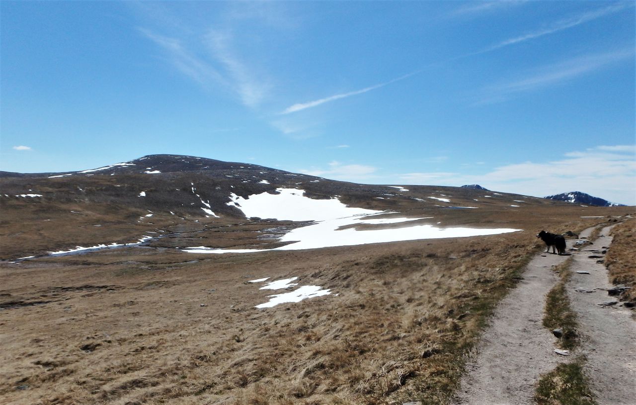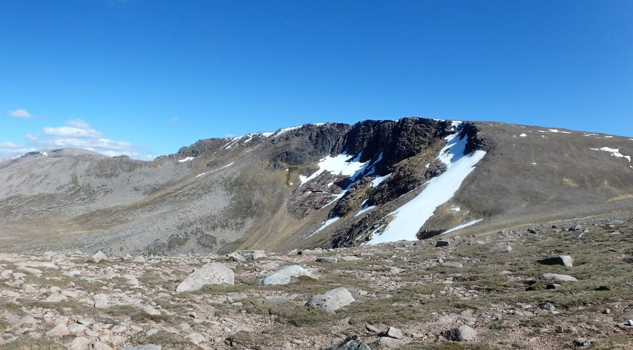 It doesn’t take long to leave the commercial scene behind, and once beyond the snow fences, I was heading into wilder country. People seeing these mountains in spring or summer would probably find it hard to believe that in winter these hills are not Alpine – they are Arctic. It was mid-May but the winter snowfields were still clinging on, although the summit was bare. The cairn was a welcome sight and it’s hard to dislike the weather station which, although it looks alien, has probably saved scores of lives by warning of dangerous weather on the way.