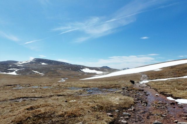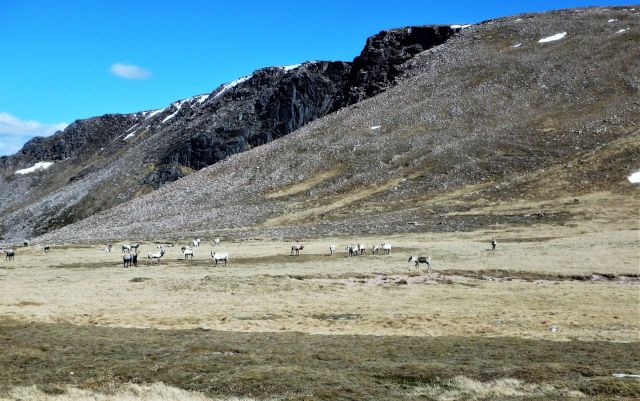 Heading towards the rim of Corrie an Lochain, with its tiny lakes that give the names to the corrie and the summit, ‘Mist’ suddenly went on alert at something ahead. Her eyesight is far better than mine, but I think it was a scent that had caught her interest. It was the reindeer herd that has been part of the Cairngorm magic since 1952. If ‘Mist’ was interested in the reindeer, they had no interest in the dog or me. We left them grazing peacefully – it was time to head for home.