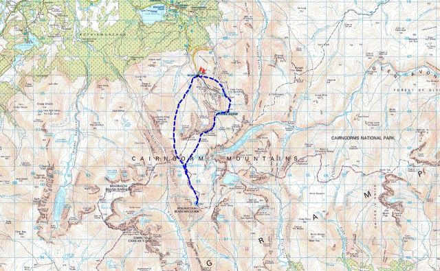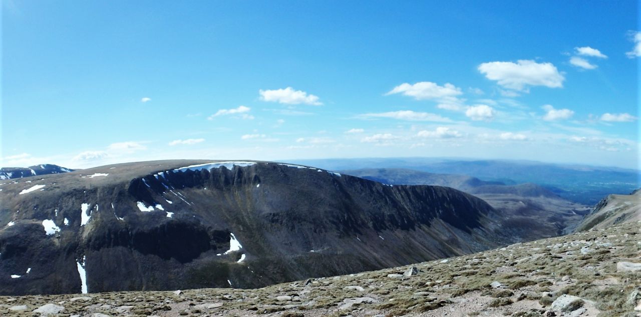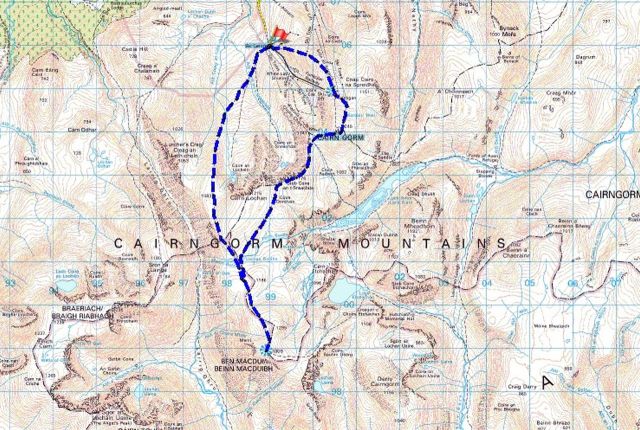 May 2019 – It was time for a return visit to the wild Cairngorm Plateau but without the weight this time. The plan was simple – starting from the Ski Centre car park, up to the Ptarmigan Station, over Cairngorm summit followed by Stob Coire an t-Sneachda then a left turn before Cairn Lochan to head for Lochan Buidhe, then on to Ben Macdui. From there a bit of backtracking would take me back to the path on the west side of Cairn Lochan before heading back below Coire an Lochain and Coire an t-Sneachda.
