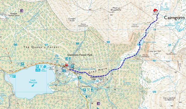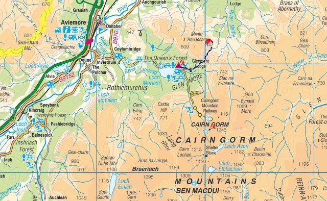 Soon after starting out from Loch Morlich, we passed Glenmore Lodge, one of the premier Outdoor Training Centres in the UK, the other one being Plas y Brenin in North wales. The original aim of the centre was “to help an individual discover their own physical, mental and spiritual potential” and for the past seventy years, ‘The Lodge’ has done just that, being the start point of hundreds of thousands of outdoor adventures in mountaineering, skiing, climbing, canoeing, etc. Many ex-students have themselves gone on to be instructors in those activities.