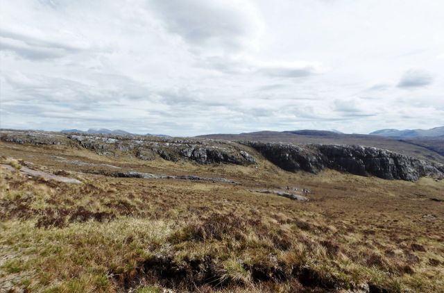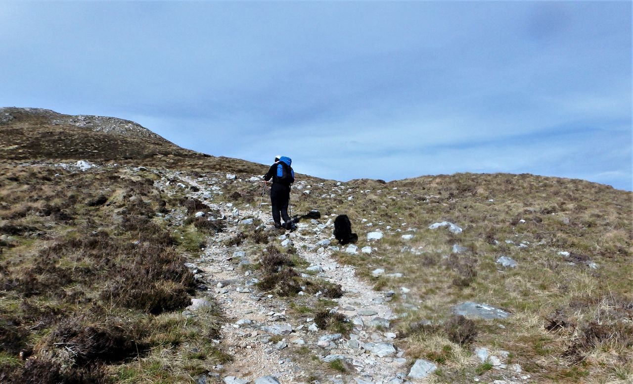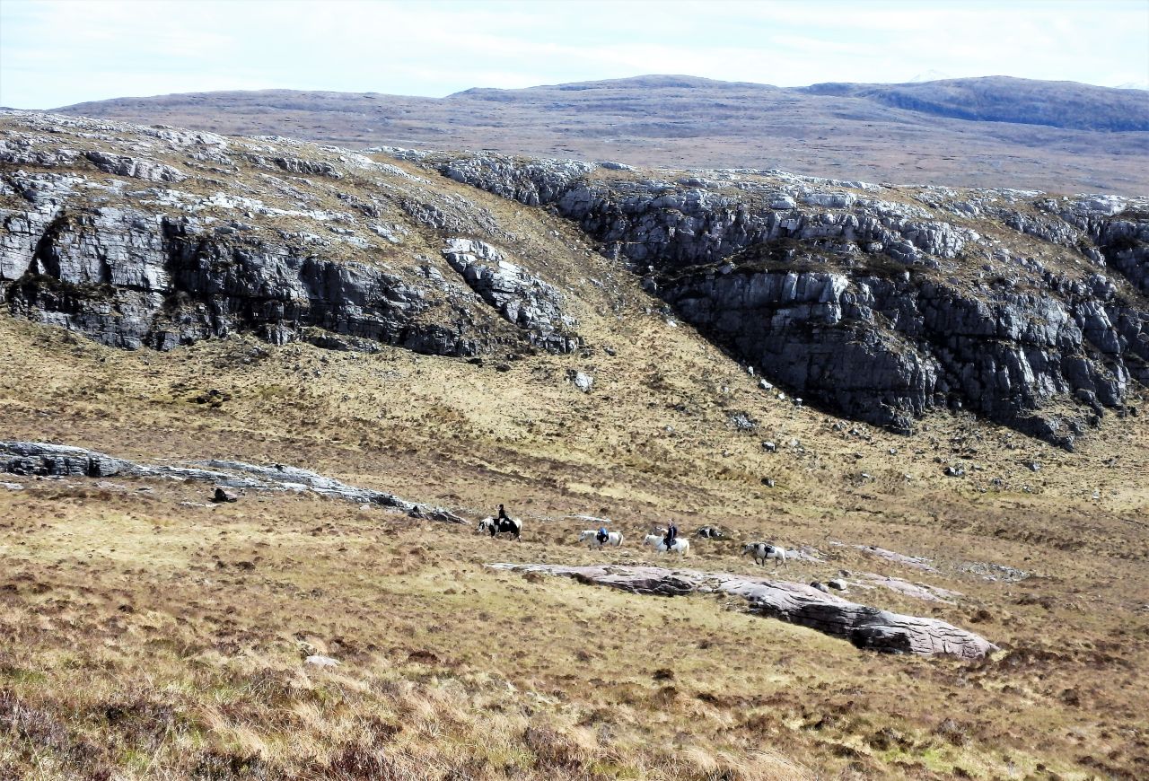 The path was easy to navigate, though a bit rough and boggy in places. By now we had traded the view of the magnificent An Teallach for a less interesting bit of moorland, with a distant view of the head of the valley of Strath na Sealga. Then I detected movement across the moor – it was two riders, each leading a packhorse. For a moment we could have been transported back a couple of centuries when travel by horse would have been the best option.