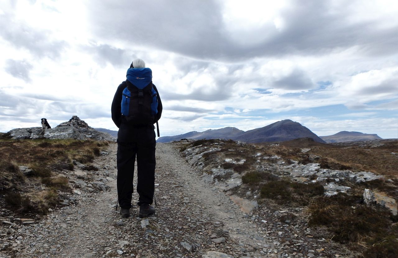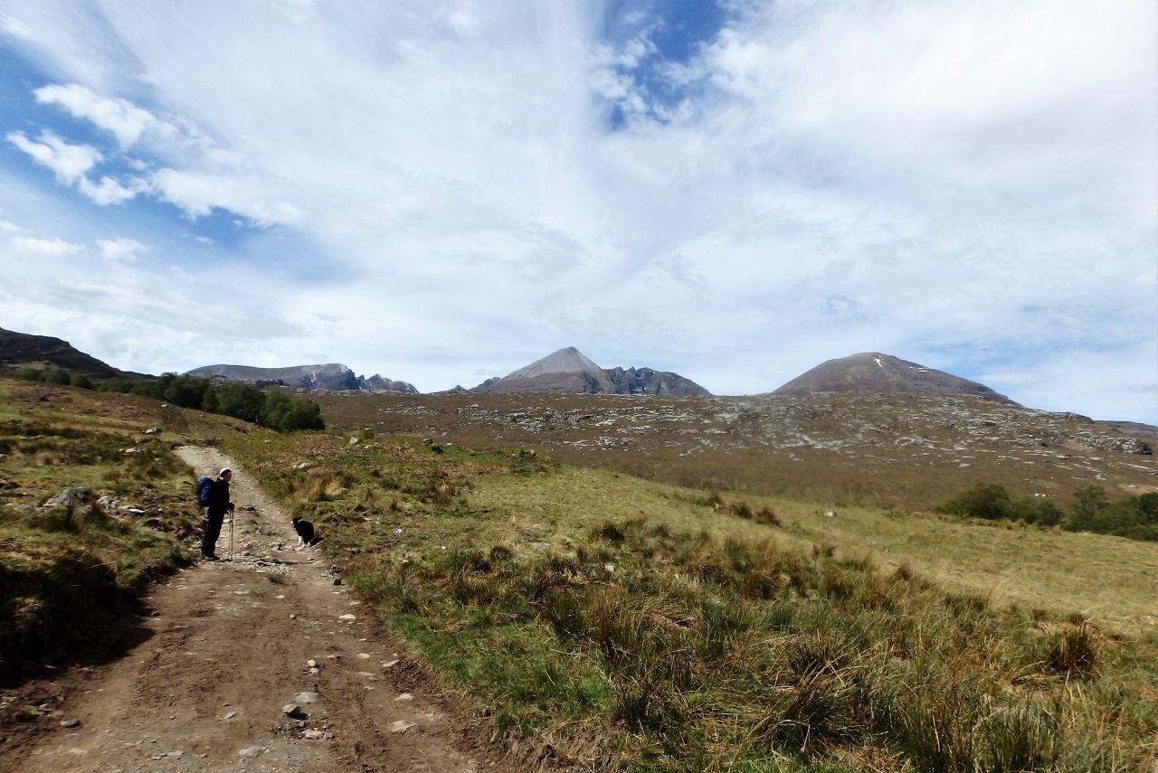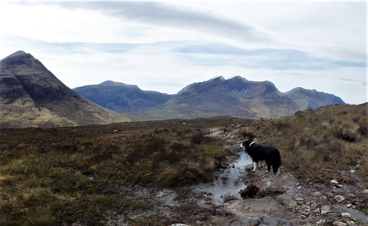 Chris and I (plus Border Collie ‘Mist’ of course) had decided on a bit of a wander into one small corner of The Great Wilderness. The name doesn’t convey the magnificence of the mountain scenery though, with the peaks of Slioch and the Fisherfield Forest being highlights, but the star of the show (well, for me anyway) was An Teallach. We set off from Coire Hallie near Dundonnell, following the Landrover track to Strath na Sealga, leaving the track at its high point to follow the rough path over the moor.