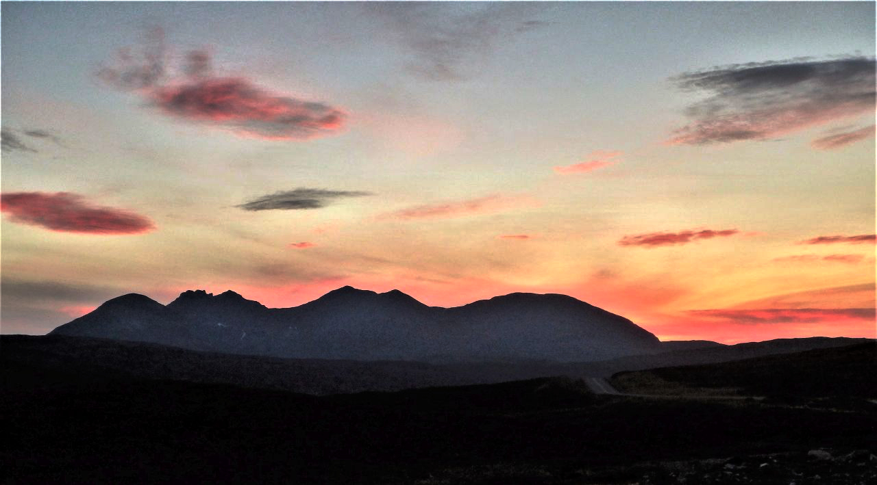 Then it was time to head back over the moor. The views opened up as we left the confines of the stream flowing down to the bothy, with An Teallach taking centre stage again. We had an extra treat with an interesting looking weather front moving through, but there was still some way to go before we finally reached the campervan on the A832. Moving further up the road for an overnight spot proved to be a great idea – as well as meeting up with our mates Richie and Babs again, we were also treated to yet another spectacular sunset. Days (and nights) in the Scottish Highlands don’t get much better than this!