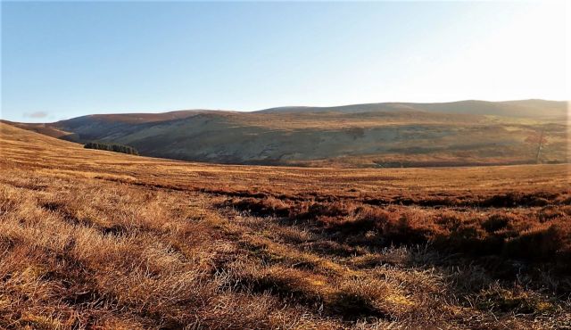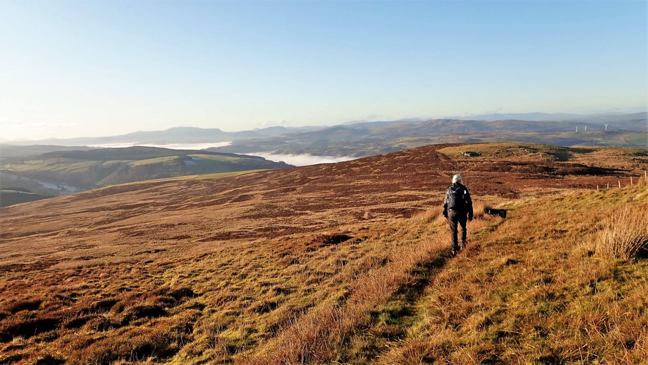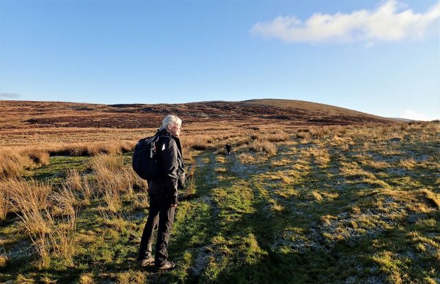 The stone circle made a good place for a lunch stop as well as a photo opportunity, but winter days are short and we didn’t stay too long. The plan was to head a little higher to Moel Pearce before taking a track down to the valley. Moel Pearce is a bit of a round lump of a hill, though it does just top the 600-metre mark, but we did have views of the main Berwyn Ridge in the distance, standing about 200 metres higher.