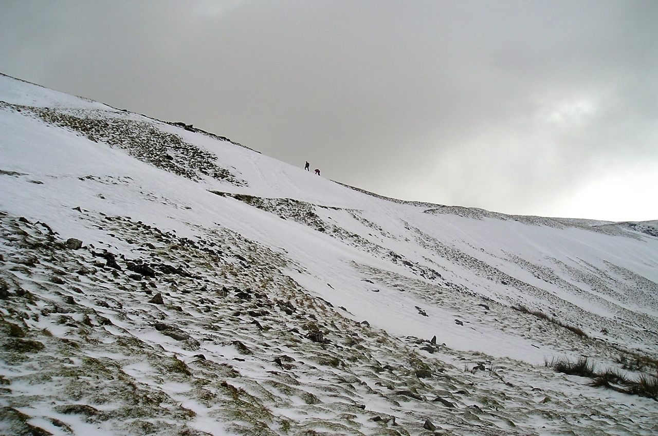 At the shelter, I chatted to a couple of hikers I had followed up the rock bands of the South Ridge – after getting their consent for a photo, I carried on down the grassy rake heading down the Pennine Way. Except, the ‘grassy rake’ was anything but! The snow had been packed down by the effects of boots and weather and was lethally slippy. There were no huge drops, but the steep slope below the rake led straight into a collection of boulders. To make matters worse, I hadn’t brought Ice axe and crampons.