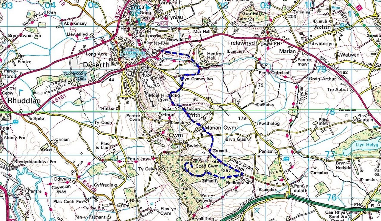 The plan was to walk out to Mynydd y Cwm (Cwm Mountain) to pick up the trail (the link route is shown as blue arrows on the map above). From there, we would follow the ODP until within striking range of home at Dyserth. A few days later, it would be back to re-join the ODP near home to walk to Prestatyn, before following a link path back to Dyserth (red arrows on the map)