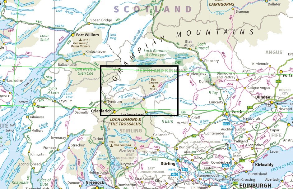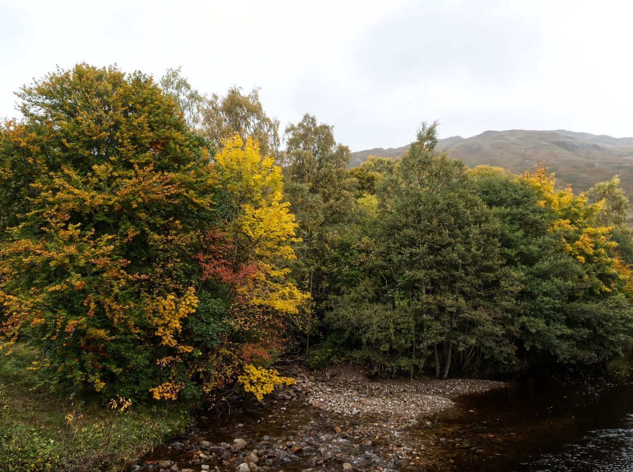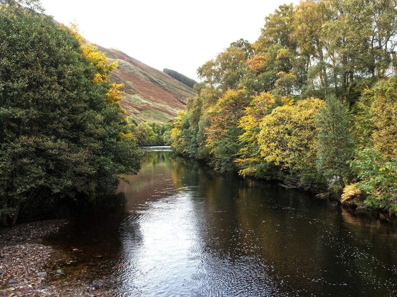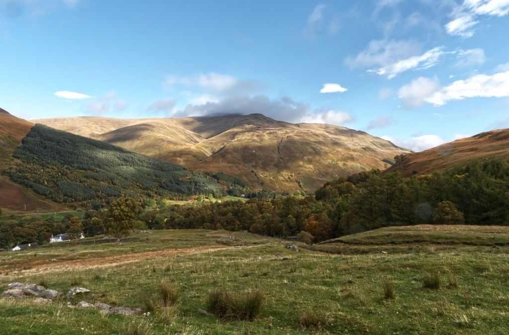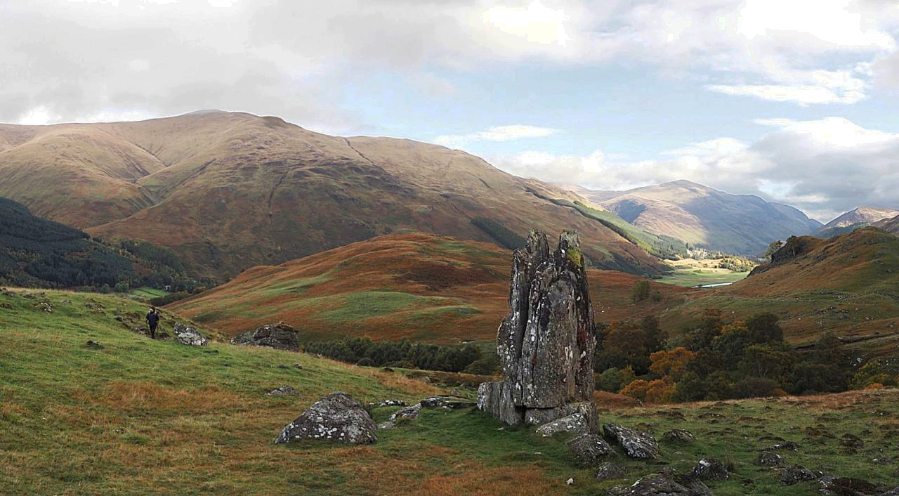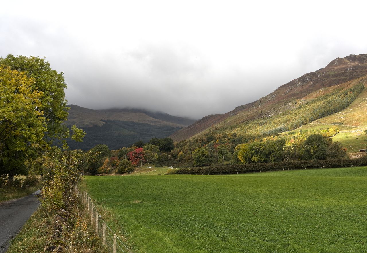The trip to see The Hands was a bit of an afterthought when we planned our Autumn 2020 Scottish tour, and as we were passing through the area, we had already decided to include a walk up Meall nan Tarmachan (see post #292). The day after that we went into Glen Lyon the long way round by Fortingall at the eastern end of the glen – the cloudy morning didn’t add much to the autumn colours, but the occasional shaft of sunlight hinted at what might have been.