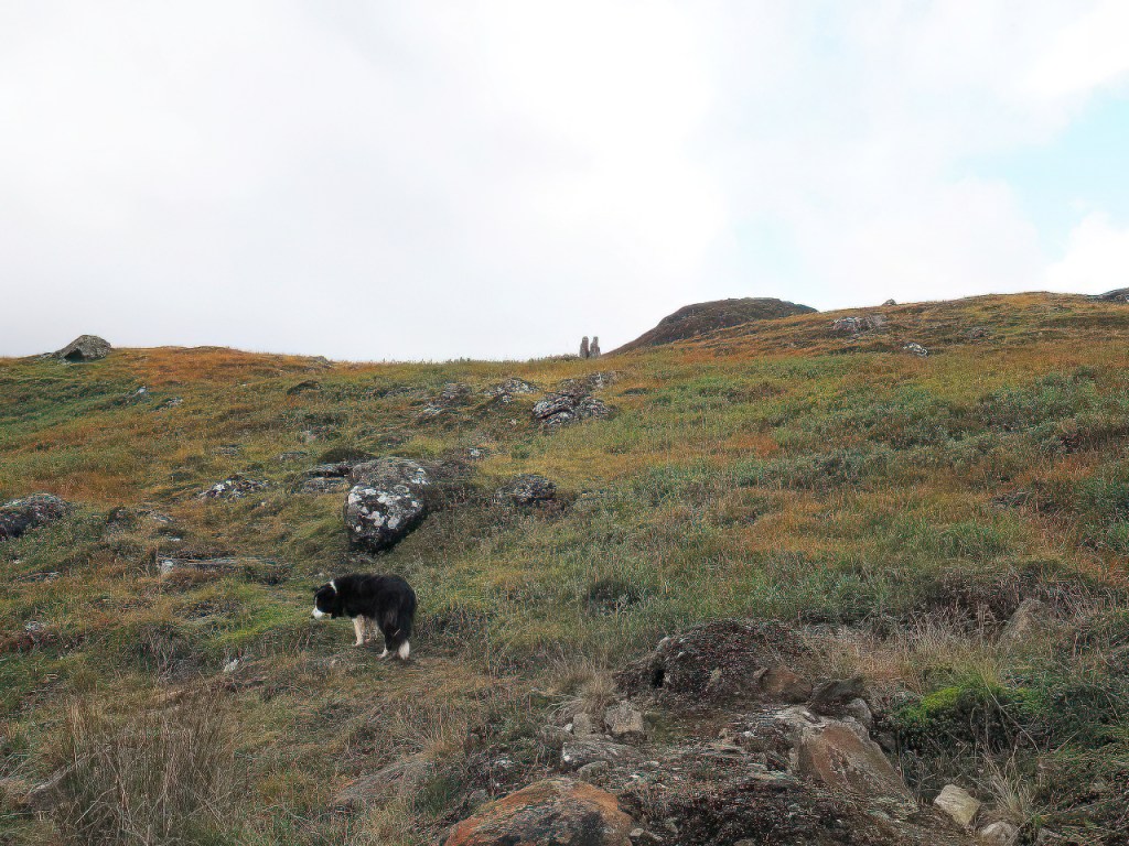 Once parked up, the walk to the hands was little more than our daily dog walk, but Border Collie ‘Mist’ wasn’t complaining. The first sighting, approaching from below as we did, are the tips of two ‘bunny ears’ – soon afterwards the stones come into full view, looking very much like a pair of praying hands.