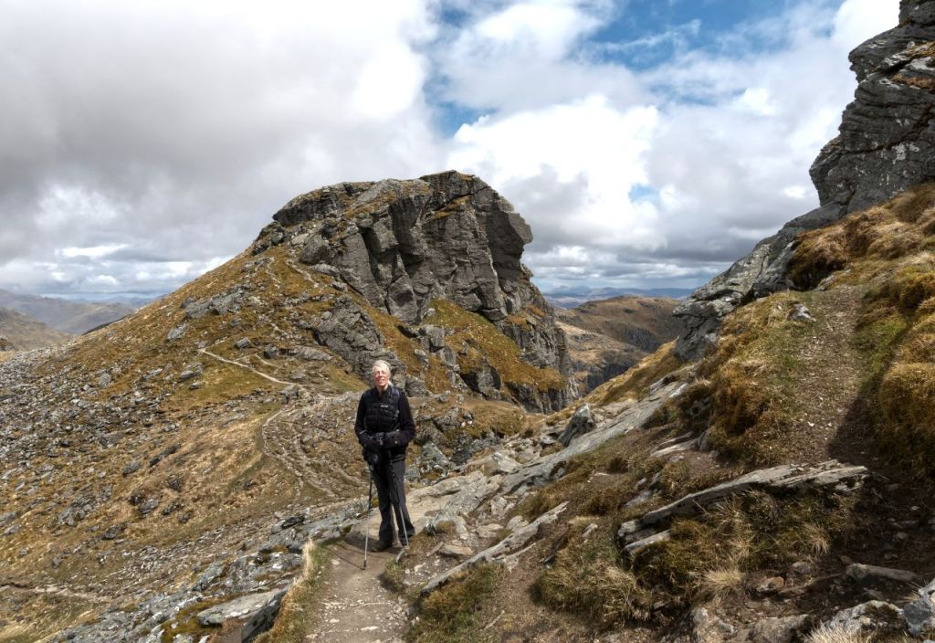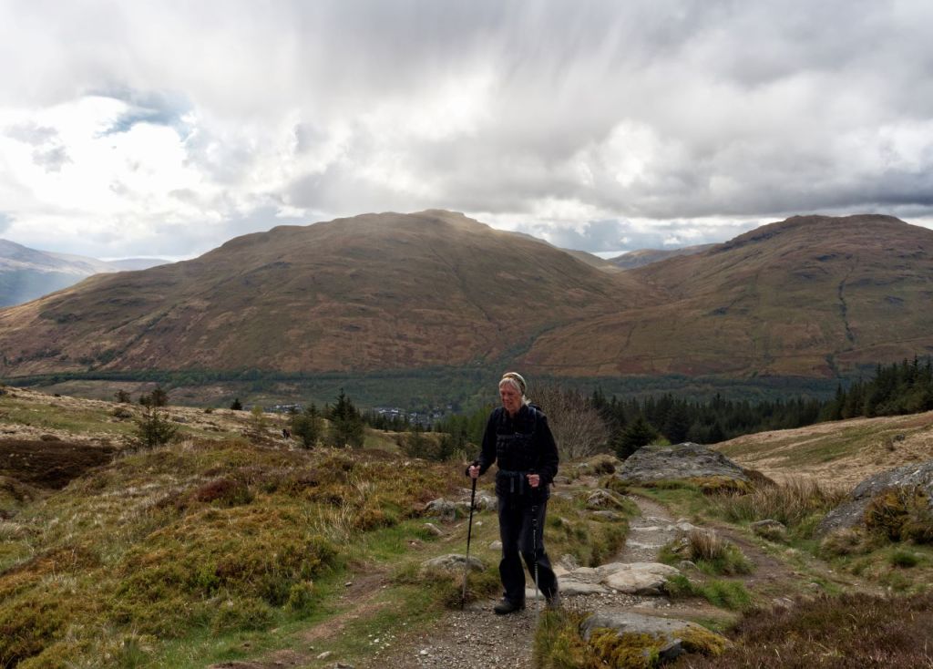 The day started cloudy, with the possibility of rain always there – mind you, that means nothing in Scotland, where you can easily experience all four seasons in one day.   The trick is to ‘travel hopefully’ and as we emerged from the forest on to higher ground, we had patches of blue sky to go with our first view of The Cobbler. Behind us was the impressive profile of Ben Lomond, last visited just seven months earlier (see post #295) and yet another popular mountain in the Southern Highlands at 974 metres (3195 ft).