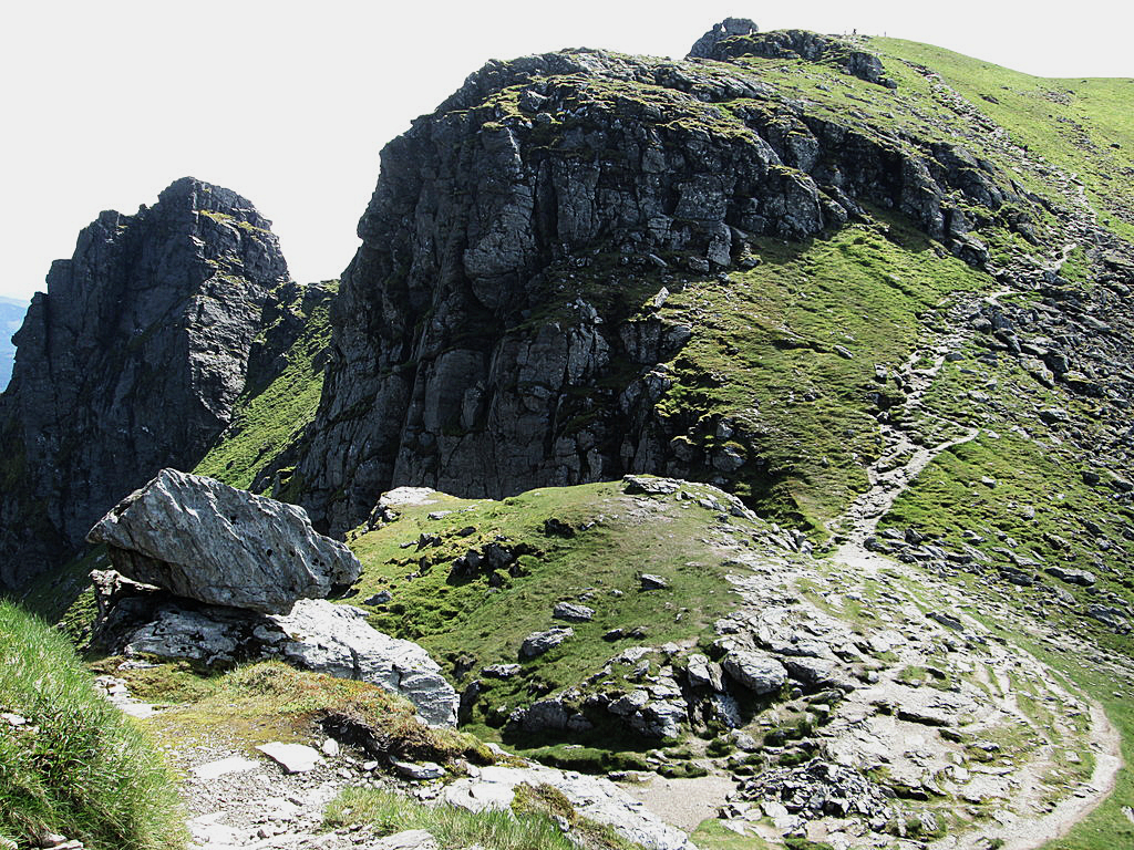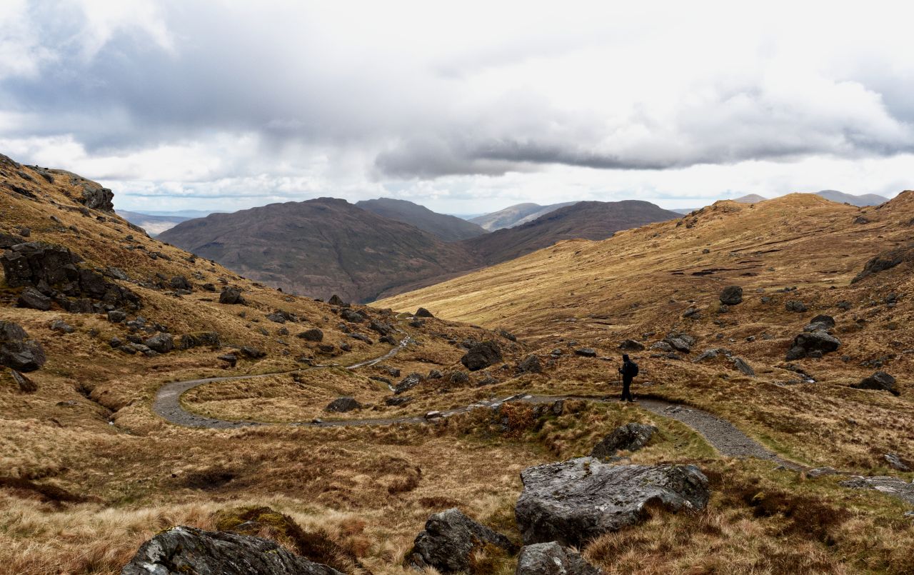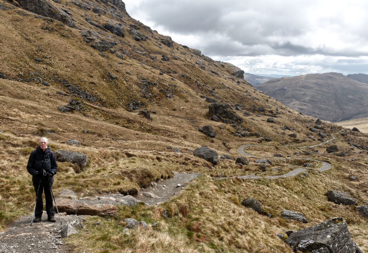 Looking back to the bealach (pass) from the stepped path up The Cobbler