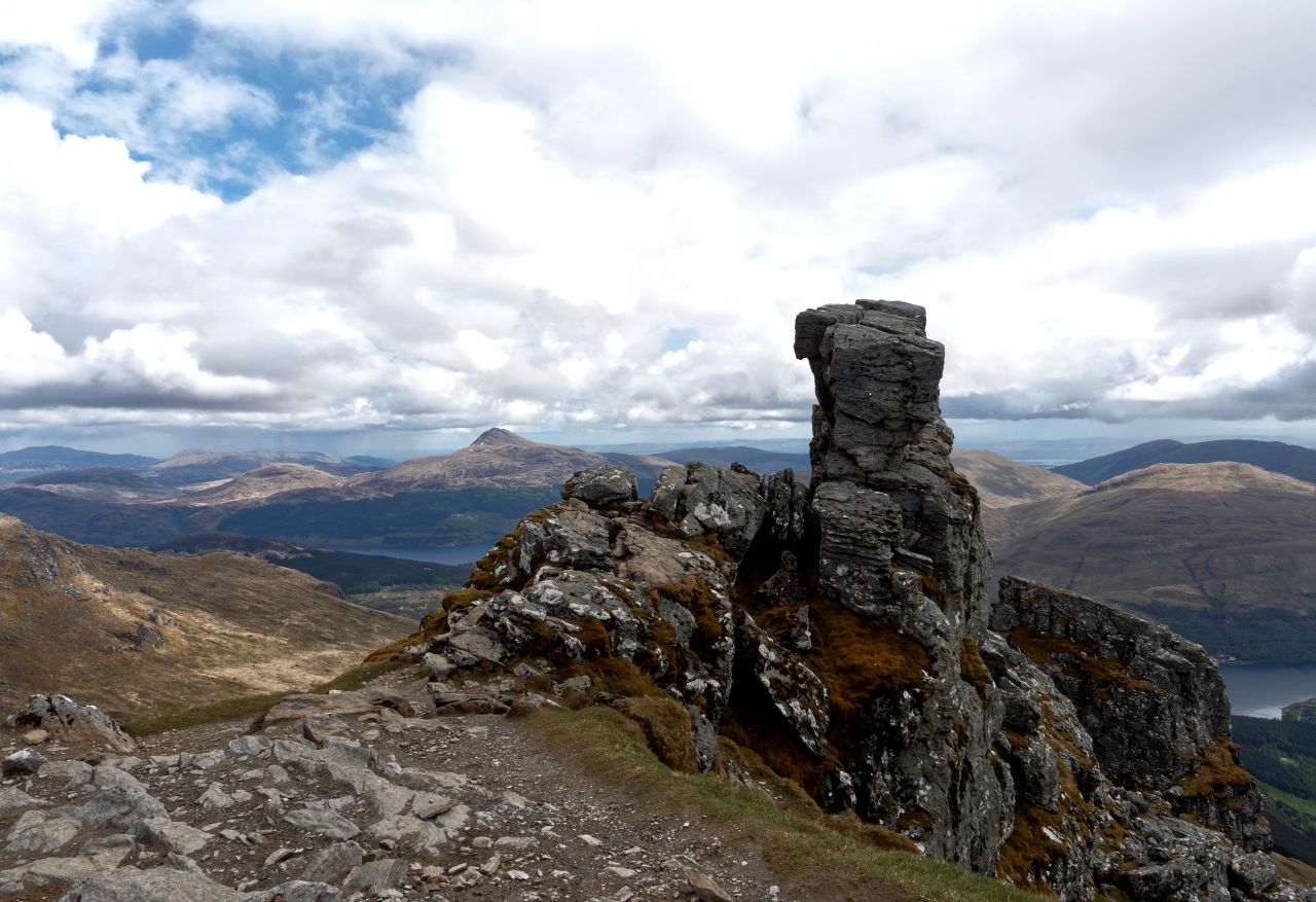 Ben Arthur (Beinn Artair in gaelic) is much better known as ‘The Cobbler’, so called because the summit rocks are supposed to look like a cobbler bending over his last.  At 884 metres (2900 ft), The Cobbler misses out on achieving the status of being a ‘Munro’ by just 30 metres (100 ft), but the unusual summit features and easy access make it one of the most popular mountains in Scotland – that would do nicely, thank you.