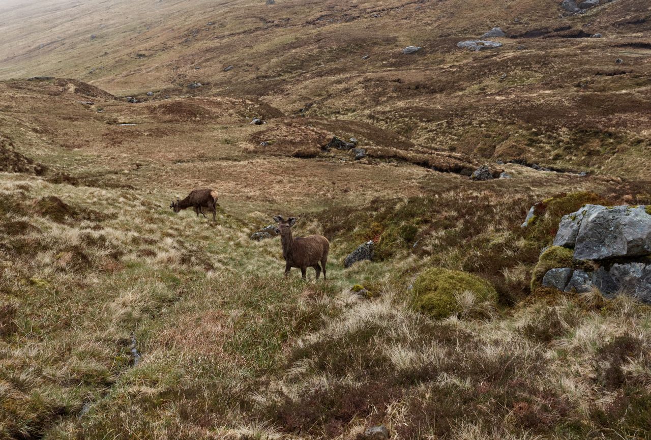 Returning by the outward route gave us the chance to take in the views from fresh angles, with the distant Ben Lomond competing with the Arrochar Alps for ‘view of the day’.  Near the Narnain Boulders we came across a pair of red deer who were clearly used to humans and Border Collies.  ‘Mist’ likewise showed no interest in them – it was nearly time for the dog’s dinner, and time to head for home.