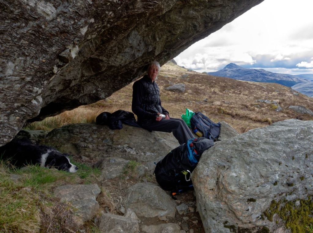 Our route for the day was a simple ‘there and back’ version.  The area is steeped in mountaineering and rock-climbing history and is known as the Arrochar Alps.  Although this was my first visit, I already knew the history of the two large boulders known as the Narnain Boulders – they were once a popular climbers bivi site, especially in the late 1800’s and the 1920-30’s, when rock climbing exploration was at its peak, but they also provided us with shelter for a coffee break.