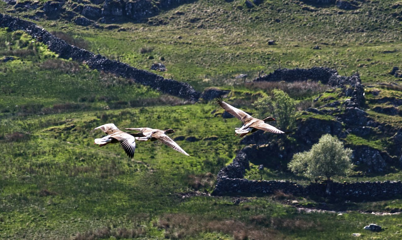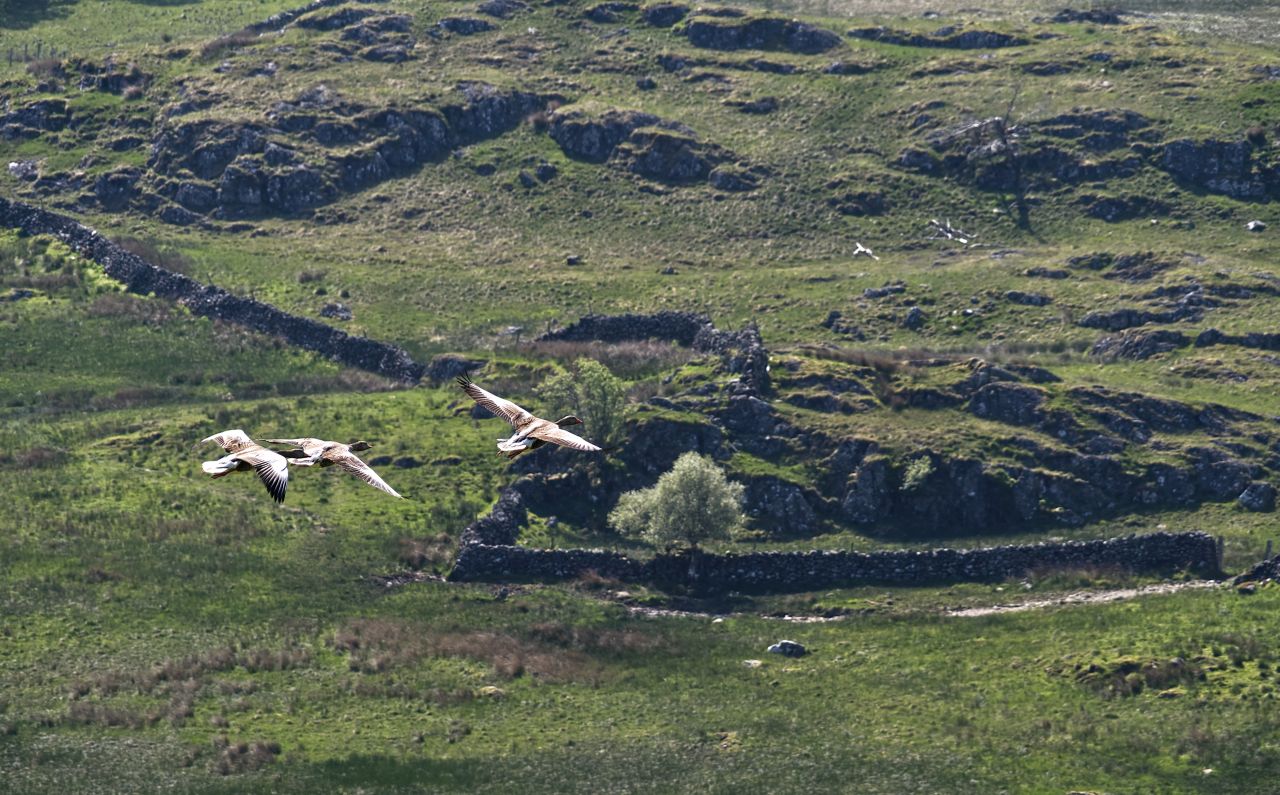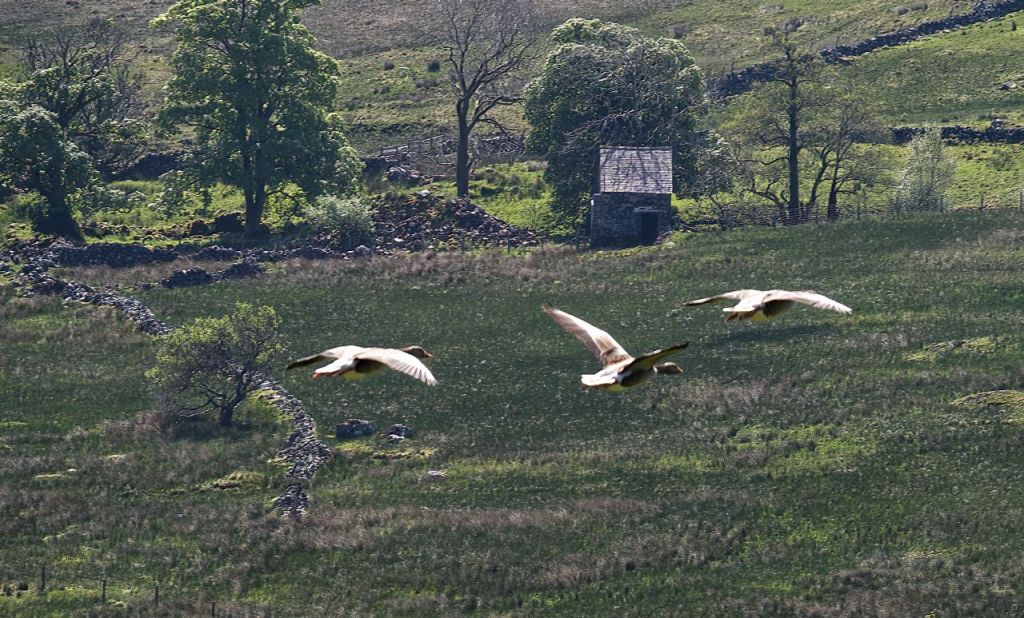 I always carry a camera on the usual 5km dog-walk circuit, mostly in the hope of getting a photo of one of the red squirrels who live in a small stand of trees on the way out to Sleddale Hall, but they are shy and secretive and so far I’ve been out of luck. Shy and secretive doesn’t describe the greylag geese who make their home on the Wet Sleddale reservoir – in May 2021 I was in the right place at the right time and managed to photograph a flight of three as they made their noisy progress up the valley.
