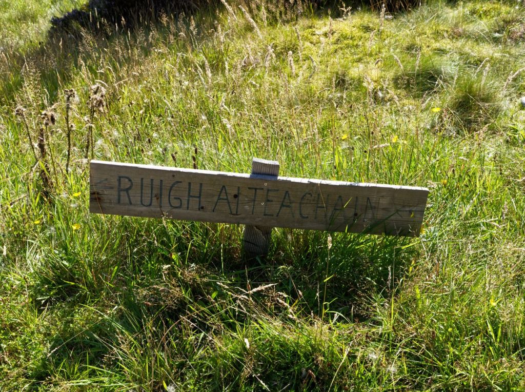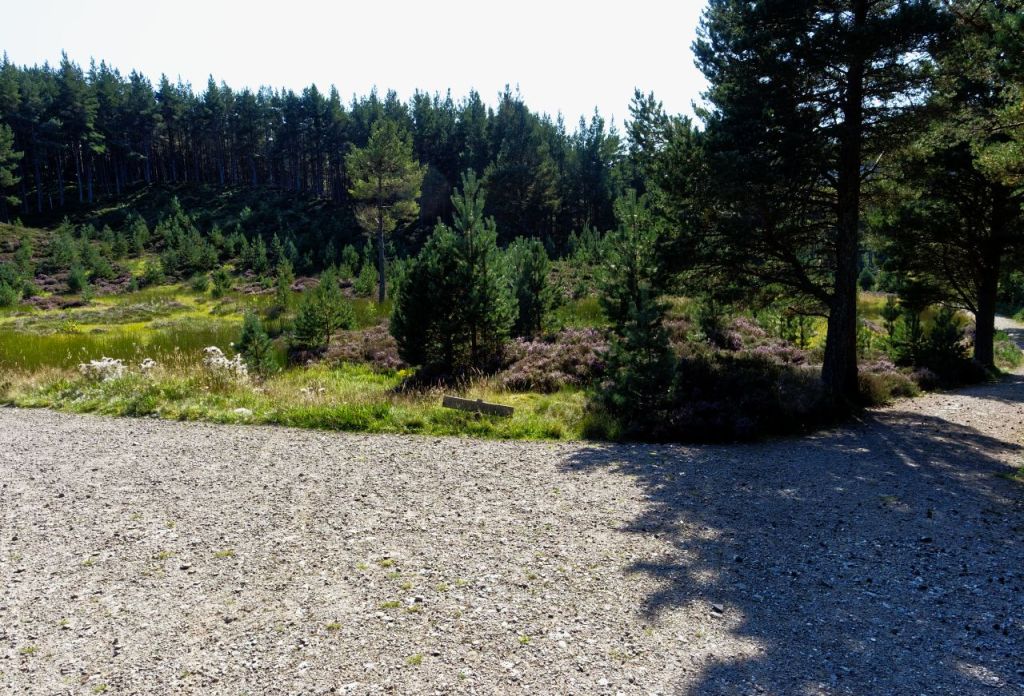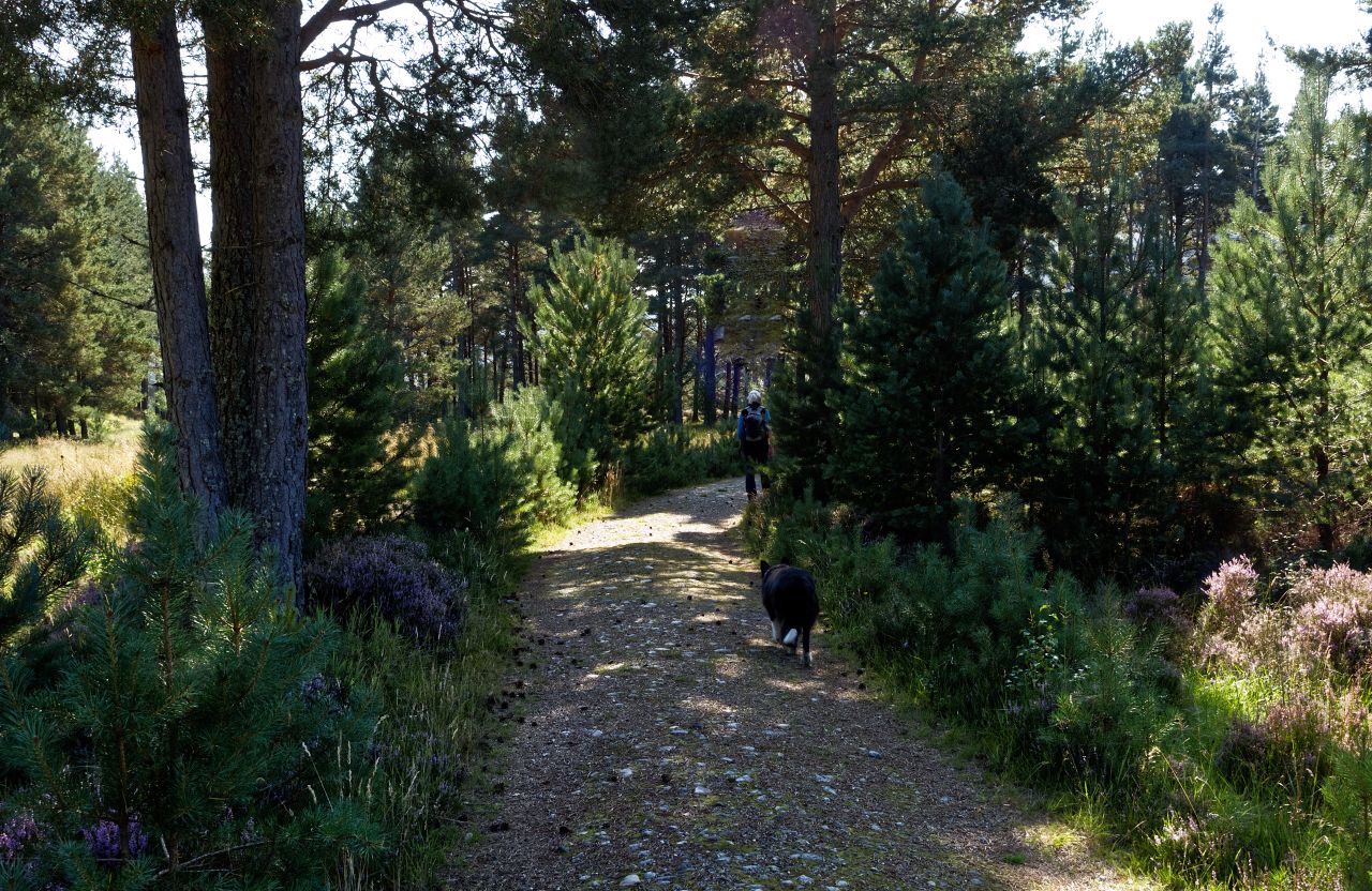 We entered the woodland beyond the Allt Garbhlach and started to make faster progress on a good 4×4 track. One of the problems of striding out and having a good natter along the way is that subtle signs can be missed – Chris and I both missed the low sign for Ruigh Aiteachain by the side of the track, and if Border Collie ‘Mist’ saw it, she wasn’t letting on.
