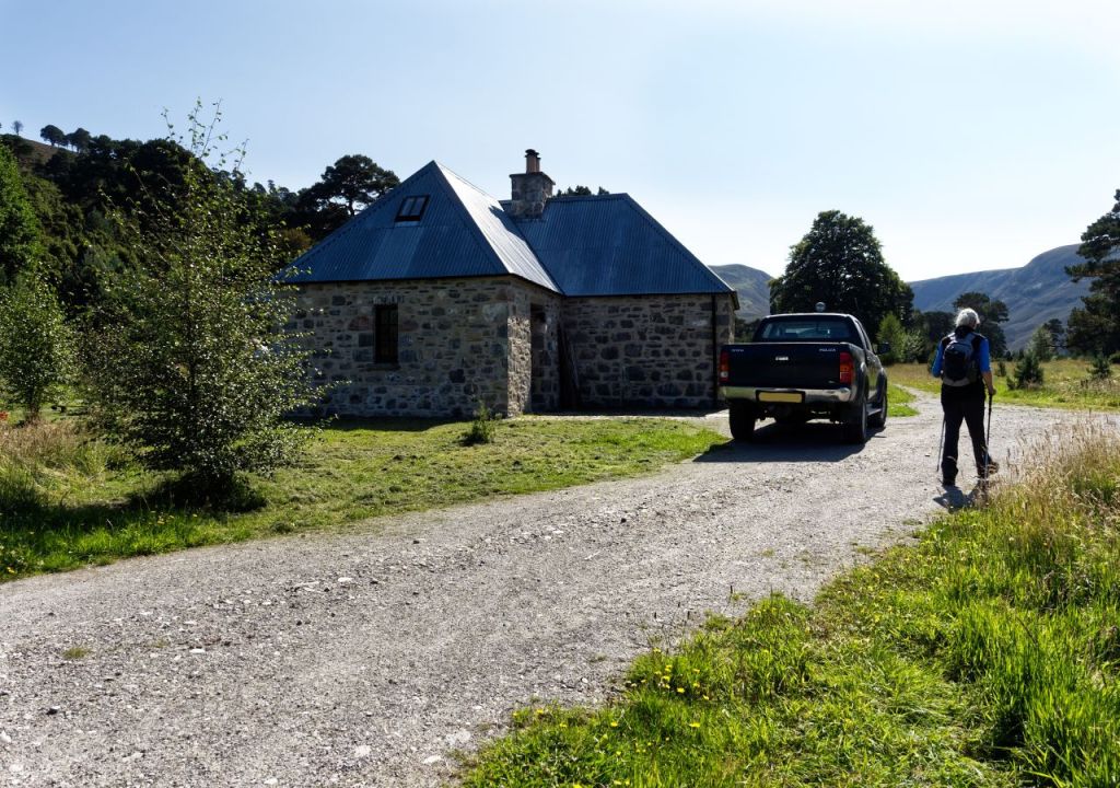 The remaining section of the 4×4 track was far enough from the river to avoid any further surprises, and a straightforward stroll took us to the bothy. Parked outside was a pickup, a sight not exactly common at Scottish bothies. The owner broke off from trimming the already trim grass and asked if we would like a cup of tea. We had just met Lindsay Bryce who is the unofficial keeper of the bothy – I’ve got to say, he keeps it in very good order!