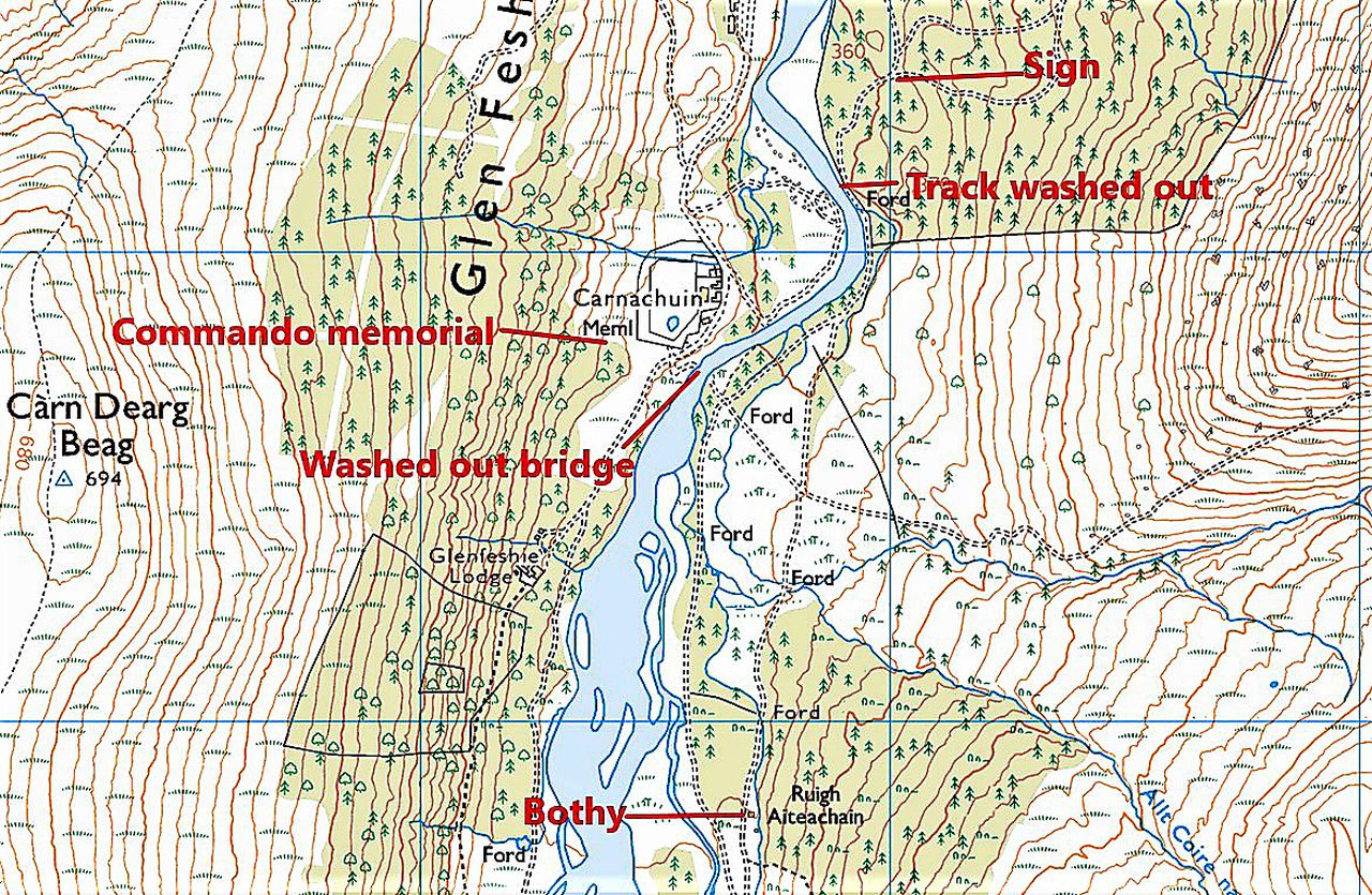 We stayed at the bothy long enough for a chat with Lyndsay followed by a lunch break, ably assisted by ‘Mist’ who can sniff out a sandwich at 100 metres, but then it was time to head back. It would have been interesting to return by the west bank of the river, but as stated earlier, the bridge at Carnachuin was still in ruins after being destroyed by floods in 2009, so we were unable to visit the Commando Memorial on the other side. (The map just above shows the locations of the washed-out bridge, the memorial and the location of the sign we missed on the way in.)