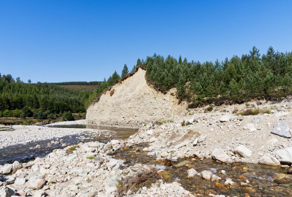 The destructive power of water became a constant theme as we travelled on up the glen. The crossing of the Allt Garbhlach stream can be problematic, even impossible, when in spate. On arrival we found that the path had been washed out – this had been re-routed in recent years to cross the Allt Garbhlach by a set of steep steps, but the diversion and the steps had been obliterated. The descent to the stream was nasty and loose – the map showed this route plus an alternative, but we later discovered in a conversation at the bothy that the paths and tracks around here change frequently due to flooding.