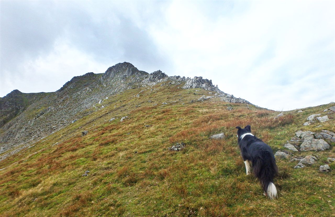 Our route was to the small hanging valley of Cwm Caseg, then up the Northeast Ridge of Yr Elen, also known as the Dragons Teeth Ridge, a route that I had followed before with Border Collie ‘Mist’ (see posts #159 and #186). On the way, we passed a wet, mossy hollow that I had not seen of previous visits, probably because this time I had taken a slightly easier line of ascent for Chris and for a Border Collie who is now officially an old girl – the upshot was that we arrived in the cwm above the tiny lake of Ffynnon Caseg (the Mare’s Well) instead of next to it.