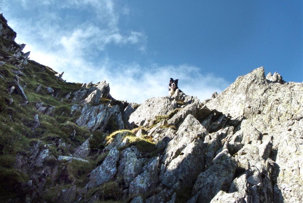 The ‘obvious drop’ was straight down to the valley we had walked up, and Chris was a less than happy bunny about the amount of fresh air below us – the views up and down the ridge were equally airy. Chris would normally have had my undivided attention on steep ground, but as mentioned earlier, we had an old, though enthusiastic, Border Collie along as well.