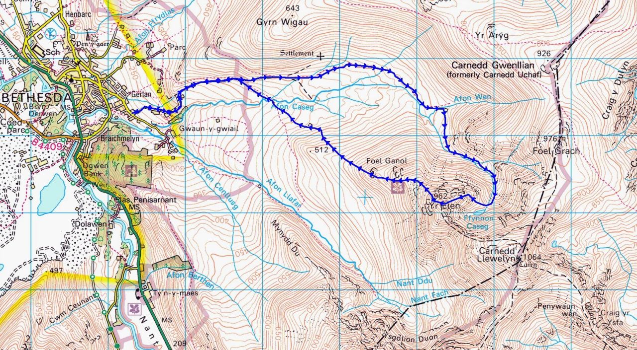 The mountain is often approached from Carnedd Llewelyn on the north-south ridge of the Carneddau – as Yr Elen is one of the fifteen 3000 ft peaks (915 metres) of Wales, hikers following the Welsh 3000’s Challenge route have to divert out and back to tick it off, adding 2.5 kms and 250 metres of height loss and gain. Not for us on this trip though – our route for the day was the quiet, lonely ascent from Gerlan, near Bethesda.
