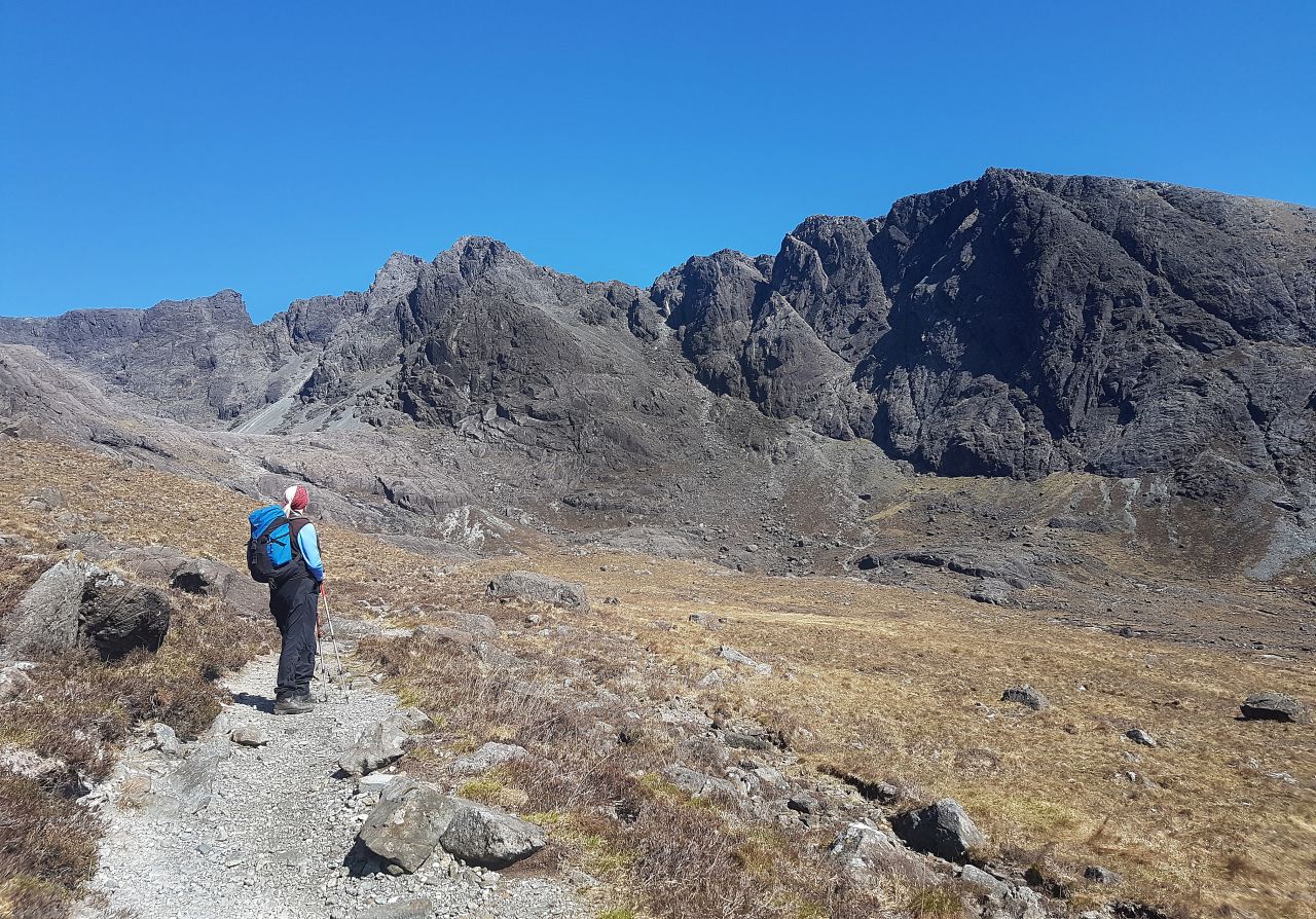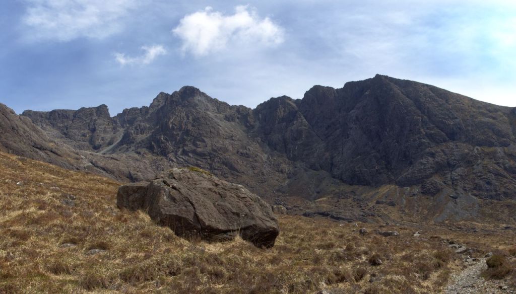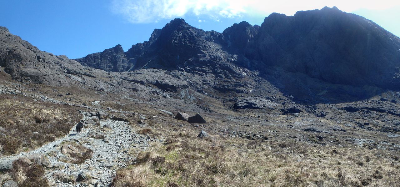 In May 2017 we had hiked up into Upper Coire Lagan on a fine and sunny day (see post #225). The upper corrie gives a taste of the grandeur of the Cuillin Ridge without having to risk serious injury or worse, so it suited me missus just fine – the photos above give an indication of just how magnificent the mountain scenery is.
