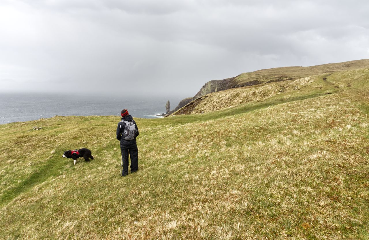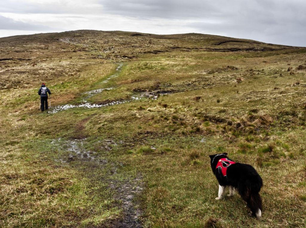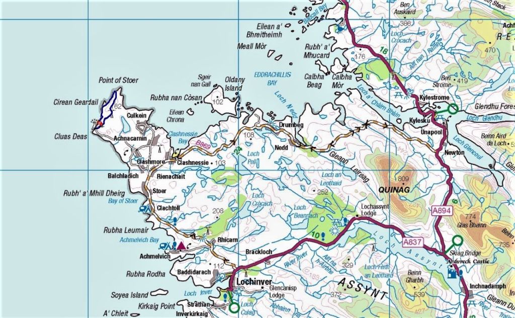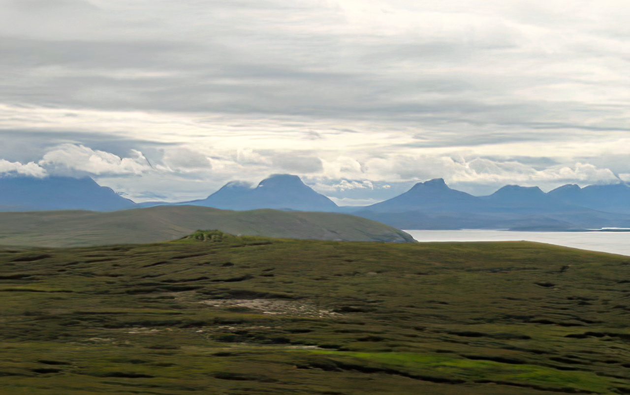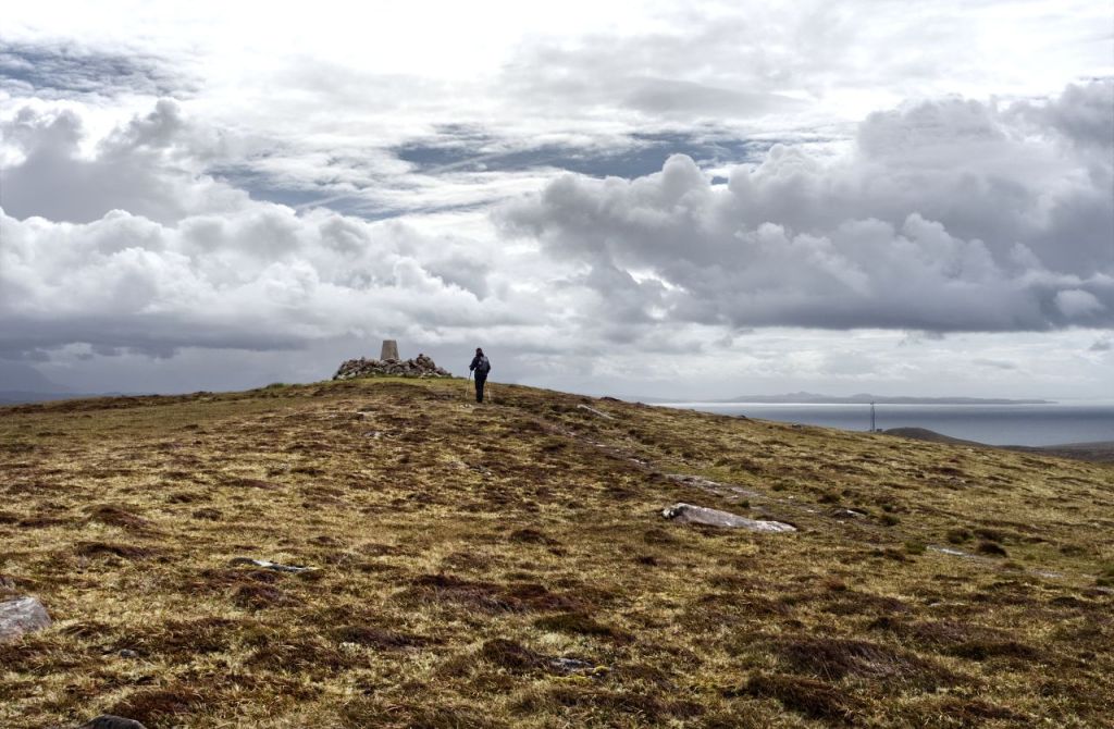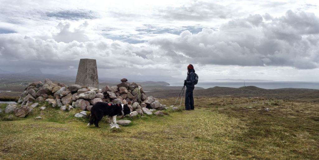 Neither dog nor humans showed any inclination to climb to the top of the stack, so we turned inland for the highest bit of ground for miles – Sithean Mor (pronounced ‘sheen more’) which tops out at 161 metres (528 ft). Sithean Mor translates as ‘The Big Fairy Hill’ but there were no fairies in evidence on this trip – perhaps fairies don’t like bad weather either. In the distance, we could see the mountains of Assynt under cloud cover, but we had a few miles to travel that day so we made our soggy way back to the van – it was time to head for home.