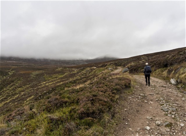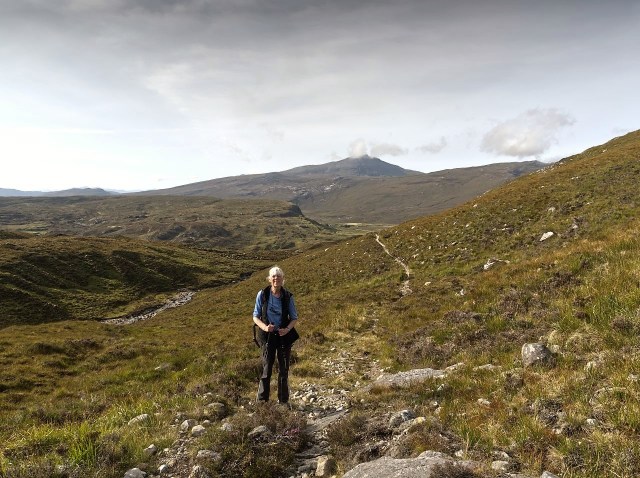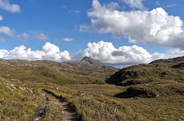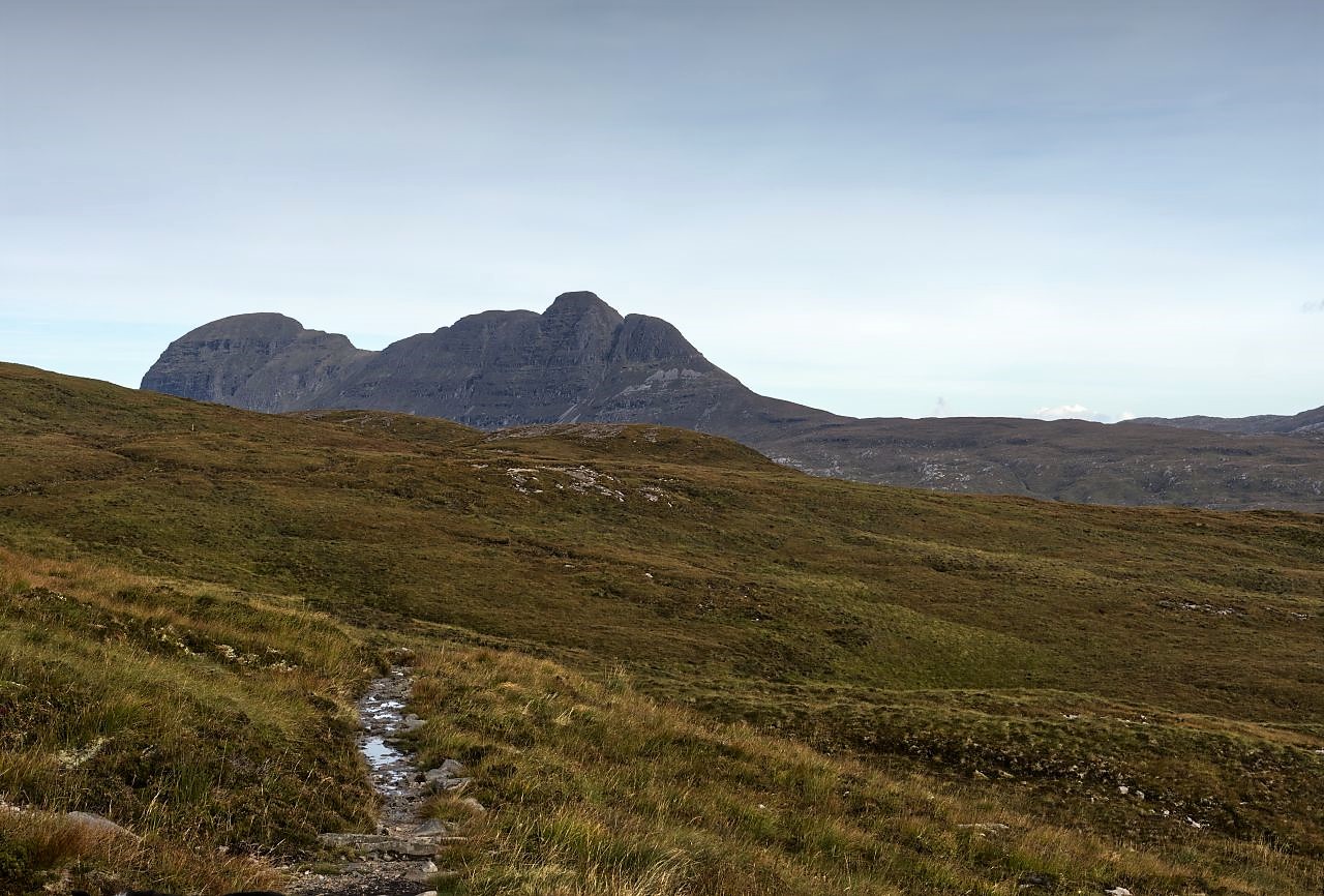 Setting out towards Glencanisp Lodge with Canisp (centre) and Suilven rising in the distance