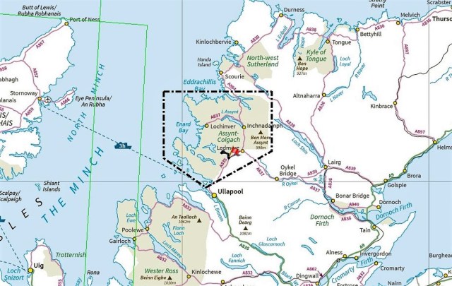Ardvreck Castle location on Loch Assynt (the red flag marks the spot)