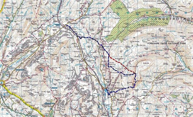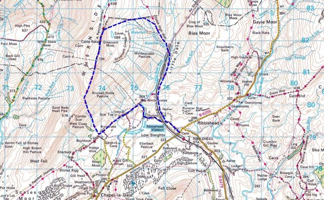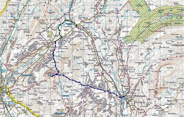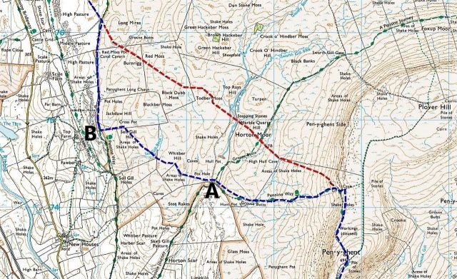 10 December 2009 had been a good day (see post #272) with Route 2 over Whernside completed in good weather. It seemed that there would be few chances, if any, to get out and find a solution to the ‘Northwest Passage’ problem before the end of the year, but four days later opportunity knocked. Chris and I took a wander up Horton Lane to Point A on the map above and set out to cross Whitber Hill.