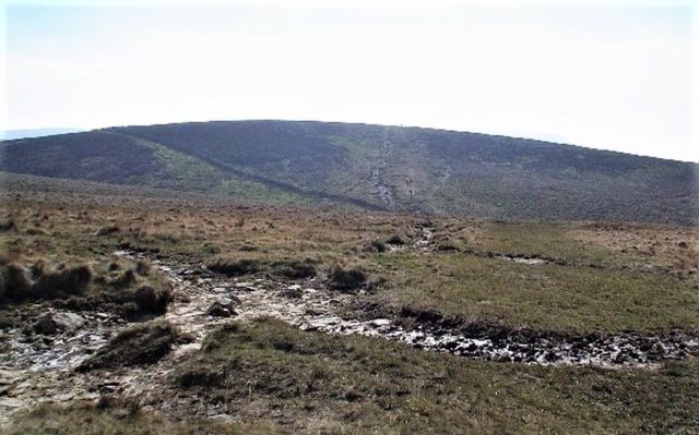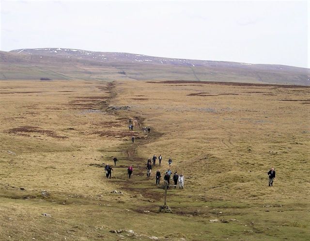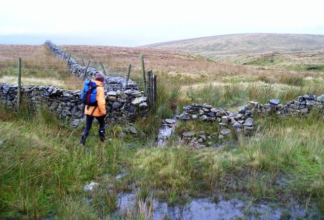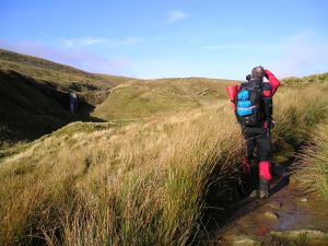 The Y3P route from the summit of Pen y Ghent to Ribblehead heads down a broad grassy rake, before setting off across country heading Northwest. What had become the ‘traditional’ route (shown in red in the map above) took a direct line towards Birkwith, crossing the area of bog on the way. Hikers tried to avoid the worst of the mire by going round it, resulting in a path about 30 metres wide which eventually became a part of the morass (note the figure in red in the second image below).