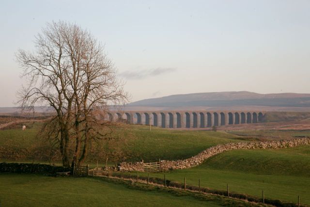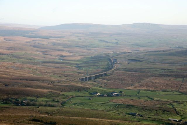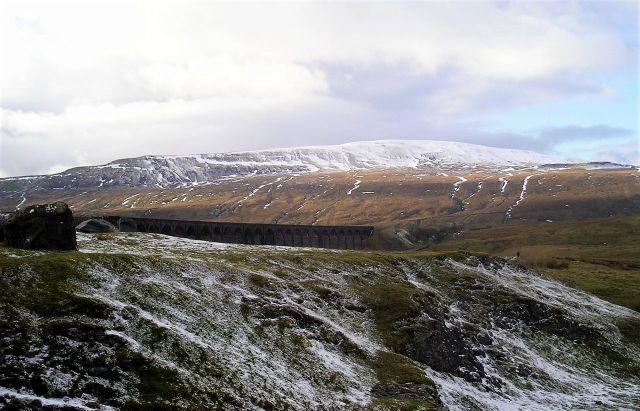 The dark line of Ribblehead railway viaduct with Whernside beyond