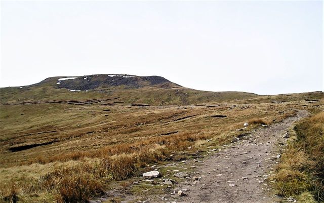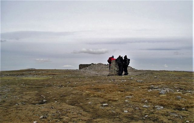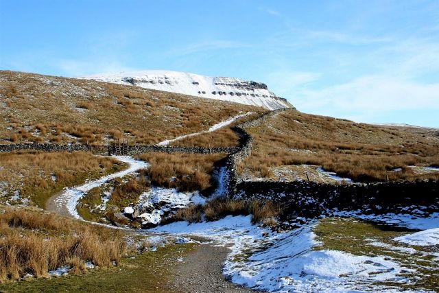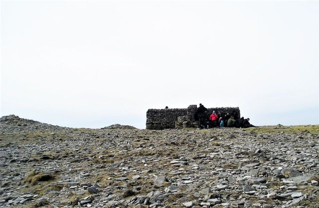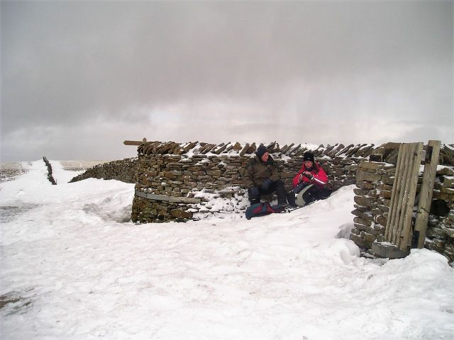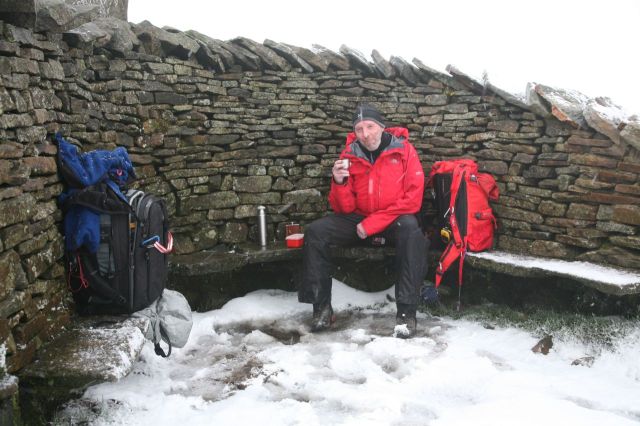 The weather forecast for 10 February suggested that sunny intervals were on the menu – good enough for me, then. To solve the travel logistics of a long linear walk, I took the train from Shipley (where I was living at the time) to Horton – the plan was to walk Route 4 over Pen y Ghent to Ribblehead, then to take the train back home. On the ascent of Pen y Ghent, it looked as though most of the winter snow had gone, but the summit shelter told a different tale.