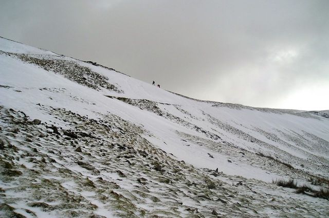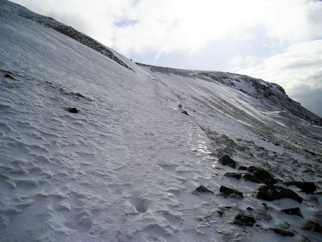At the shelter, I chatted to a couple of hikers I had followed up the rock bands of the South Ridge – after getting their consent for a photo, I carried on down the grassy rake heading down the Pennine Way. Except, the ‘grassy rake’ was anything but! The snow had been packed down by the effects of boots and weather and was lethally slippy. There were no huge drops, but the steep slope below the rake led straight into a collection of boulders. To make matters worse, I hadn’t brought Ice axe and crampons.