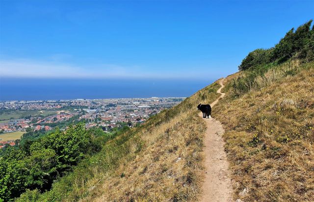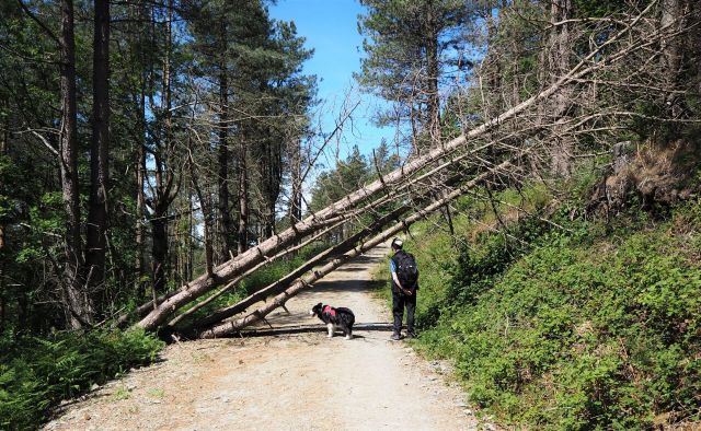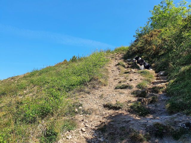 A slip would probably have been survivable but ploughing into the boulders below would have hurt – a lot! 40+ years of mountaineering experience without a serious injury, plus a ‘dollop’ of guile and cunning, got me down the rake in one piece, but I was glad to be off it. Looking back up the hill, I saw that the two hikers I had spoken to at the summit had also recognised the potential danger of the rake, but their solution was to try and pass above the obstacle. I don’t know how worried they were, but my heart was in my mouth as they teetered across the slope, and I waited below until they reached safe ground.